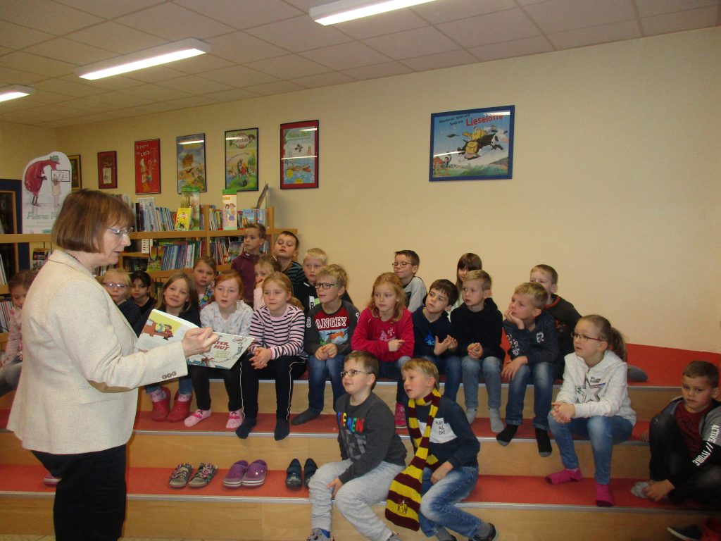 Die Erzieherin Sandra aus dem Kindergarten St. Hedwig las den Kindern aus den 1.Klassen das Buch „Der Regenbogenfisch 2“ vor, welches mit eindrucksvollen Bildern begeisterte. Ein „Fisch-Fingerspiel“ beendete die Vorlesestunde. Wie jedes Jahr begeisterte unsere Bürgermeisterin Frau Droste die 2. Klassen – dieses Mal mit dem Buch „Der Kater mit Hut“. Ganz spontan erklärte sich die FSJlerin Luca aus der Paul – Moor – Schule bereit, den 3. Klassen aus den „Vorstadtkrokodilen“ vorzulesen. Die 4. Klassen freuten sich besonders auf ihren Vorleser. Herr Sajak, der Vater unserer Lehrerin Frau Sajak, las spannend und toll betont (Zitat Lea) die „Nordseedetektive“ vor.